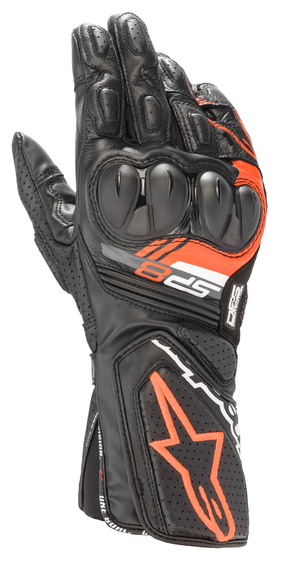 Az SP-8 V3 bőrkesztyű egy univerzális, versenyzői DNS-t tartalmazó kesztyű, amely rendkívül kopásálló, teljes szemű kecskebőrből és szintetikus bőrből készült, és magas szintű védelmet nyújt a fejlett MotoGP-eredetű SP kettős sűrűségű bütyöknek köszönhetően. Előre kialakított ujjkonstrukcióval, horoggal és hurokkal záródó mandzsettával, valamint új, anatómiailag profilozott markolatbetéttel a tenyéren és a hüvelykujjon ez a kesztyű biztonságos és rendkívül személyre szabott teljesítményt nyújtó motoros illeszkedést, valamint magas szintű mozgást és kényelmet biztosít.